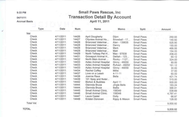 See Vet Bills Paid by Small Paws Rescue for the first 25 days of April, 2011, totalling $27, 813.17 which is an average of $1,112.52 per day.
