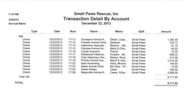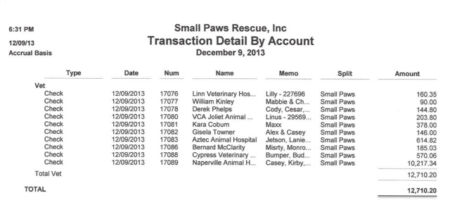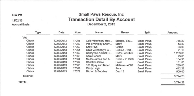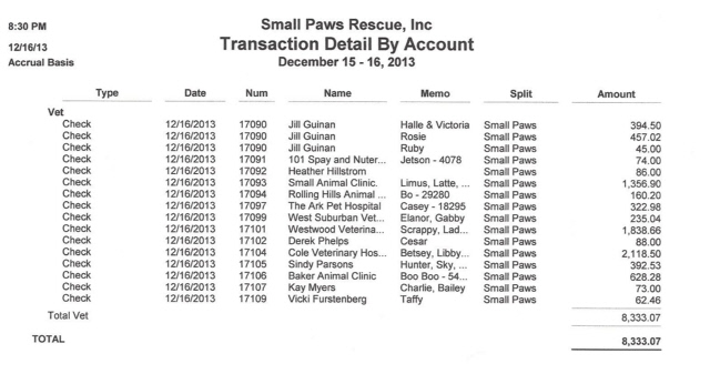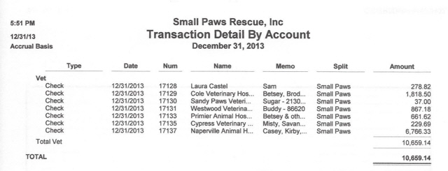 See vet bills paid by Small Paws Rescue for December, 2013, totalling $44,188.32 which is an average of $1,425.43 per day.