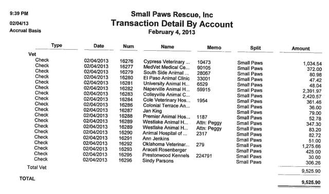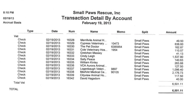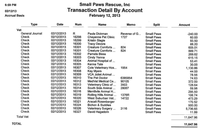 See Vet Bills Paid By Small Paws Rescue For The First 25 Days of February 2013, totalling $28, 883.14 which is an average of $1, 155.33 per day.