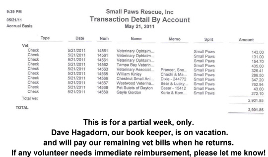 See Vet Bills Paid by Small Paws Rescue in May of 2011 totalling $33, 991.80 for the first 19 days of May, which is an average of $1, 789.04 per day.