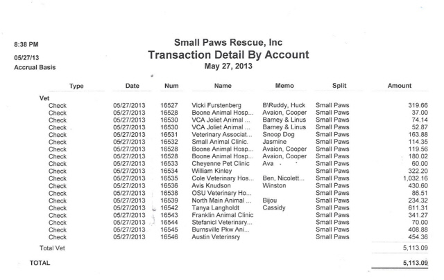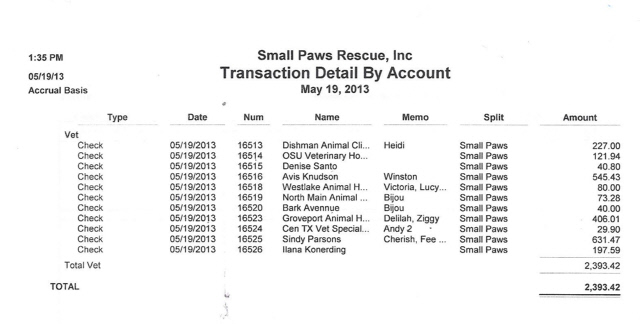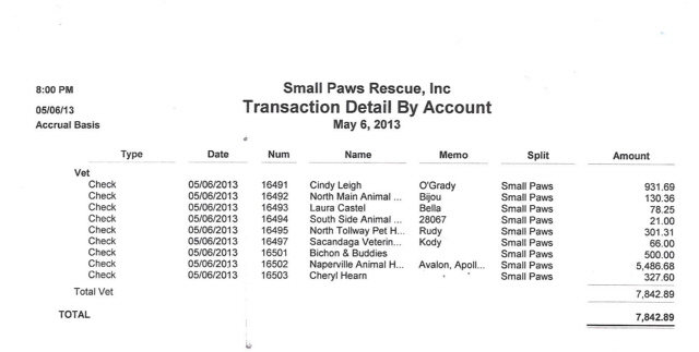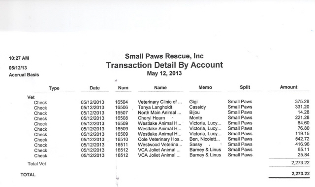See Vet Bills Paid By Small Paws Rescue For The First 27 Days of May, 2013, totalling $17,622.62 an average of $652.69 per day.