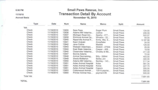 Vet Bills Paid by Small Paws® Rescue in November of 2010 totalling $37, 368.90 for the first 29 days of November, which is an average of $1, 288.58 per day.