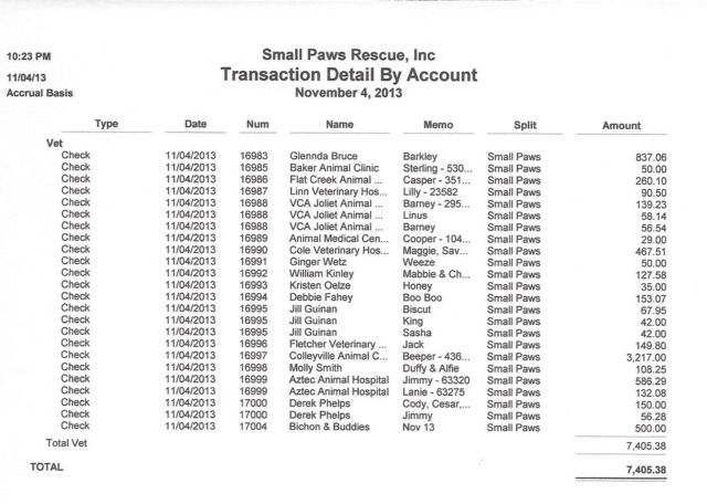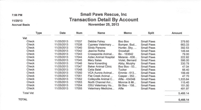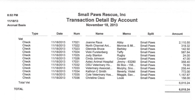 See Vet Bills Paid By Small Paws Rescue For The First 25 Days of November, 2013, Totalling $30,051.21 Which Is An Average Of $1,202.04 Per Day.