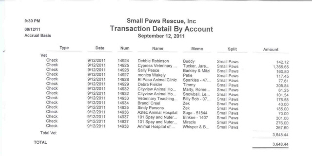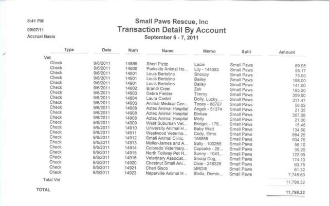 See Vet bills Paid By Small Paws Rescue For The First 26 days in September of 2011 totalling $29, 331, 32 which is an average of $1, 128.13 Per Day.