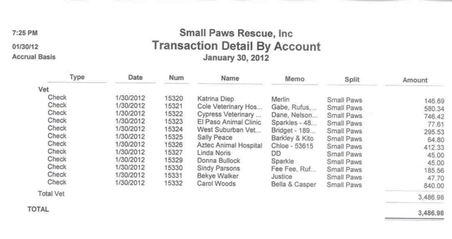 See Vet Bills Paid by Small Paws Rescue For The First 23 Days of January, 2012 Totalling $31,390.97 Averaging $1,012.61 Per Day.