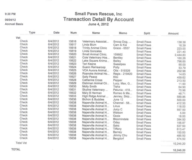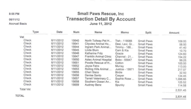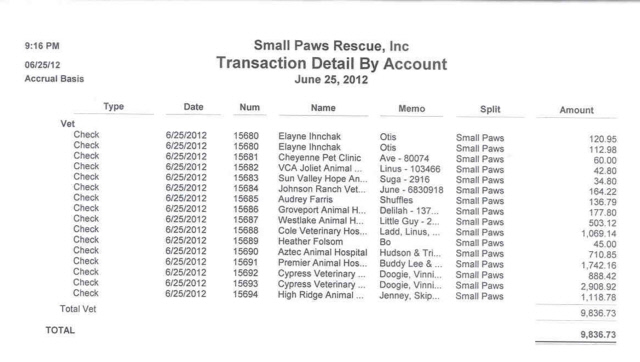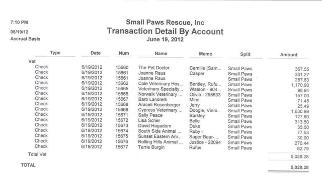 See Vet Bills Paid By Small Paws Rescue in June of 2012 For The First 25 Days of June Totalling $27, 641.66 Averaging $1,105.67 Per Day.