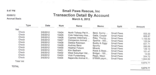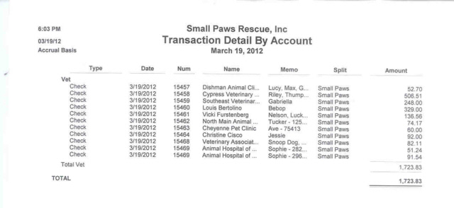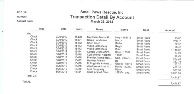 See Vet Bills Paid by Small Paws Rescue Totalling $21, 038.53 for the First 26 Days of March, 2012
