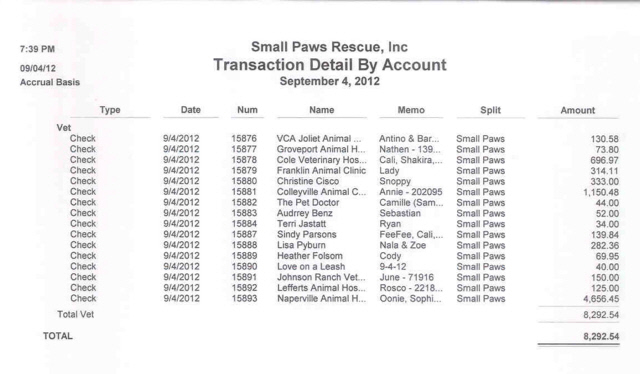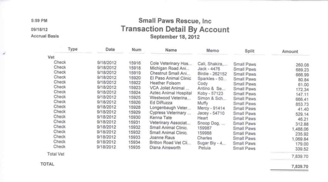 Vet Bills Paid by Small Paws Rescue For The First 24 Days of September, 2012, Totalling $29, 250.95, An Average of $1,218.79 Per Day.